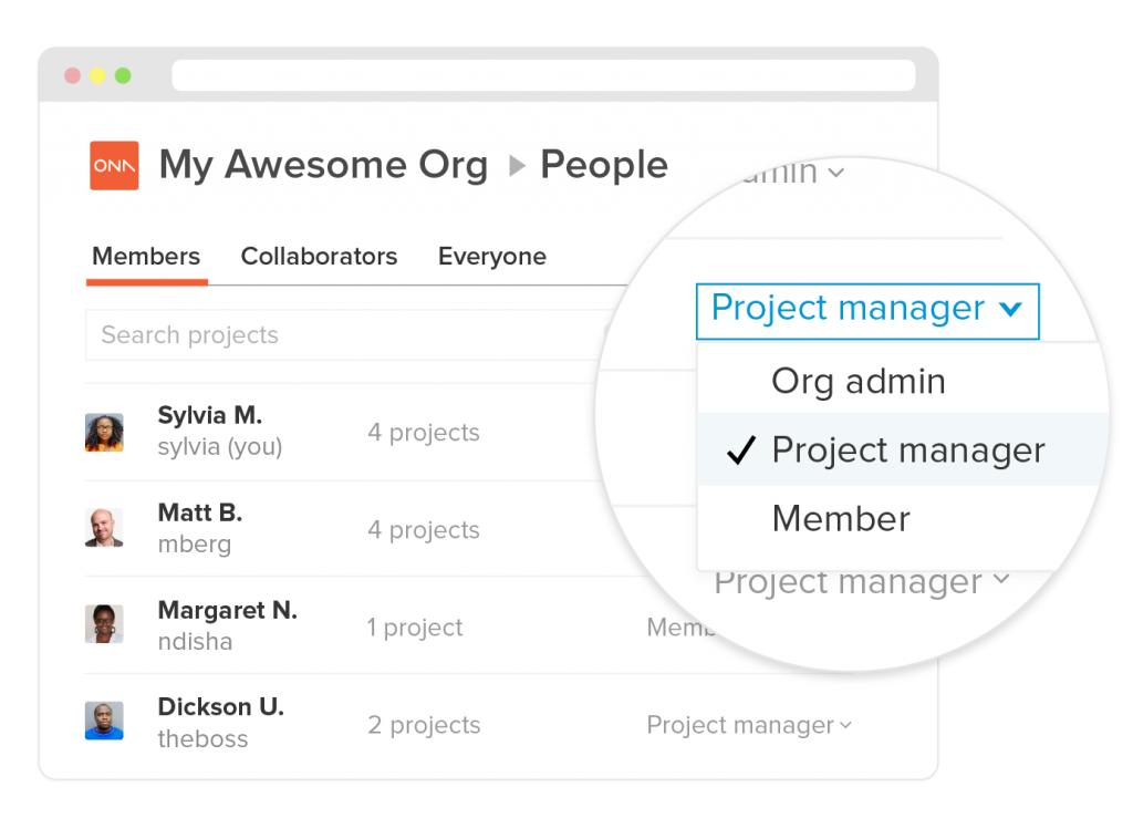 With Ona organizations, information across projects and across your enterprise is accessible at your fingertips. You can either create one organization or one organization for each programme to have central access to data. Organizations also make it easy to manage permissions centrally for your organizations’ mission critical data.